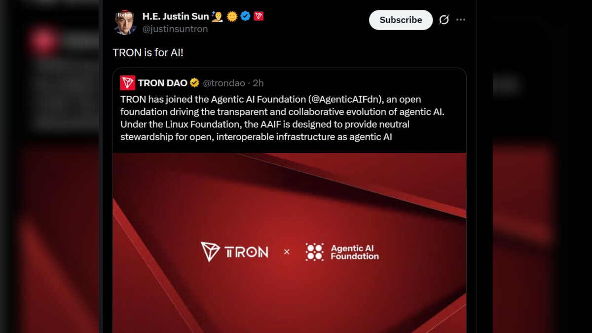 More than just joining the group, Tron will also hold a seat on the foundation’s governing board, giving it a voice in shaping the future standards for how AI agents interact with blockchain infrastructure.