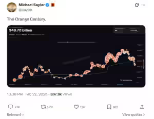 Nearly six years after the company dipped its toes into the cryptocurrency world in 2020, Saylor signaled on X this past Saturday that another buy could be imminent, posting a chart from StrategyTracker with the caption “The Orange Century.”