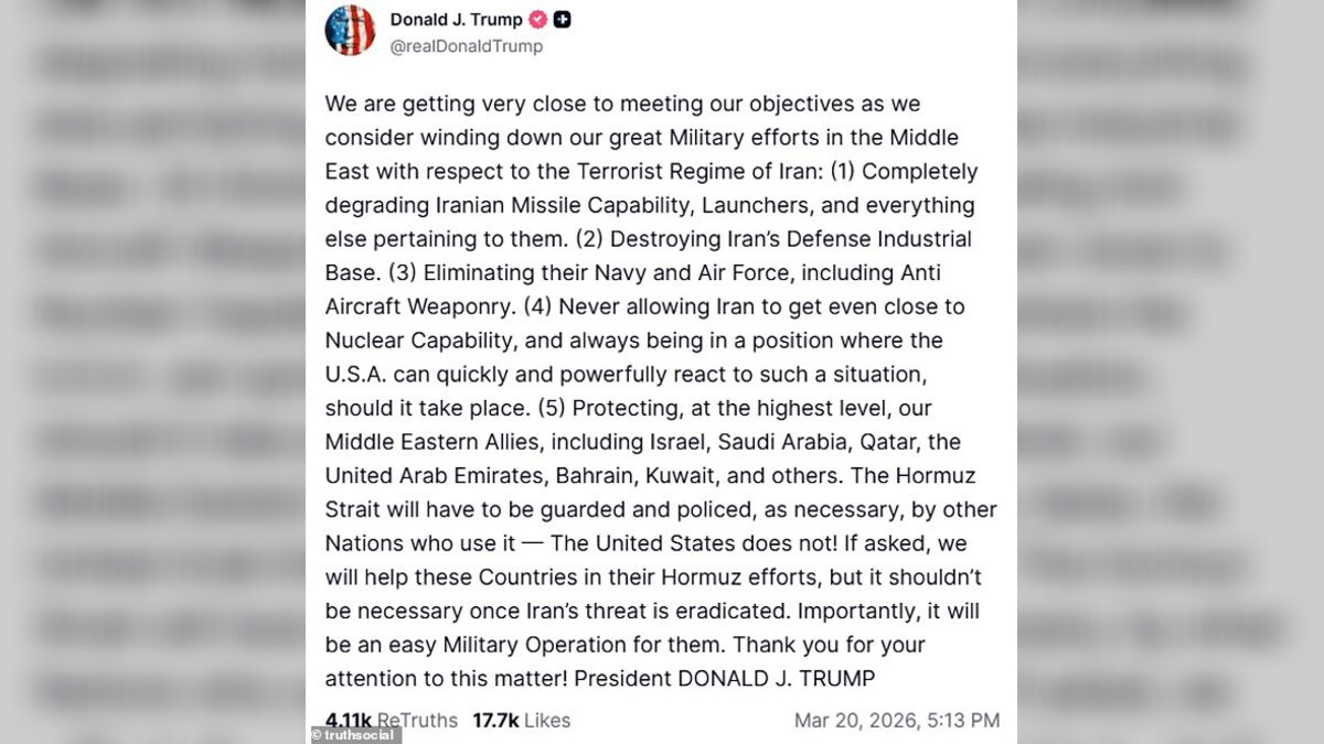 President Trump suggested on Truth Social that the U.S. is close to achieving its objectives in its campaign against Iran and may begin to scale back military efforts in the Middle East.